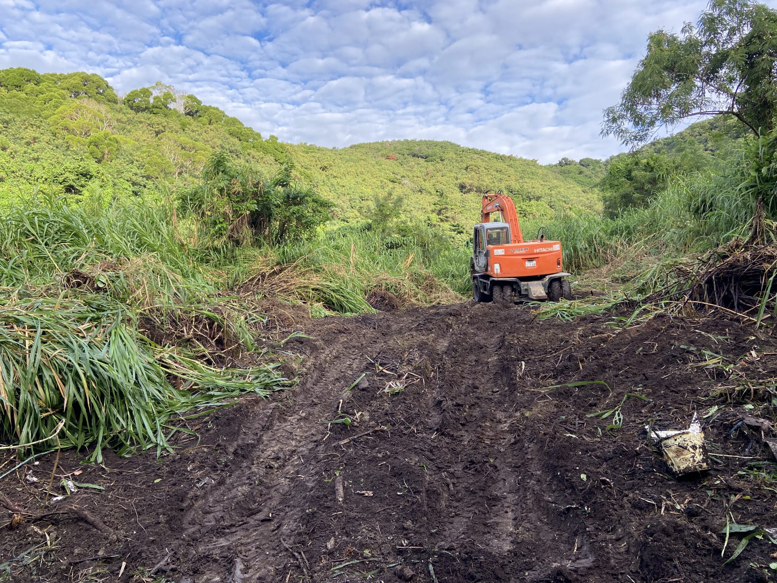 10年以上放棄されていた畑の再生事業開始いたしました。地元の西原重機さんにお願いして大型の重機をつかって大きな木や、雑草を取り除いもらい農地に再生していただいてます。土の状態は自然の状態で枯れ葉が落ち微生物が分解したふかふかのいい土になっていました。